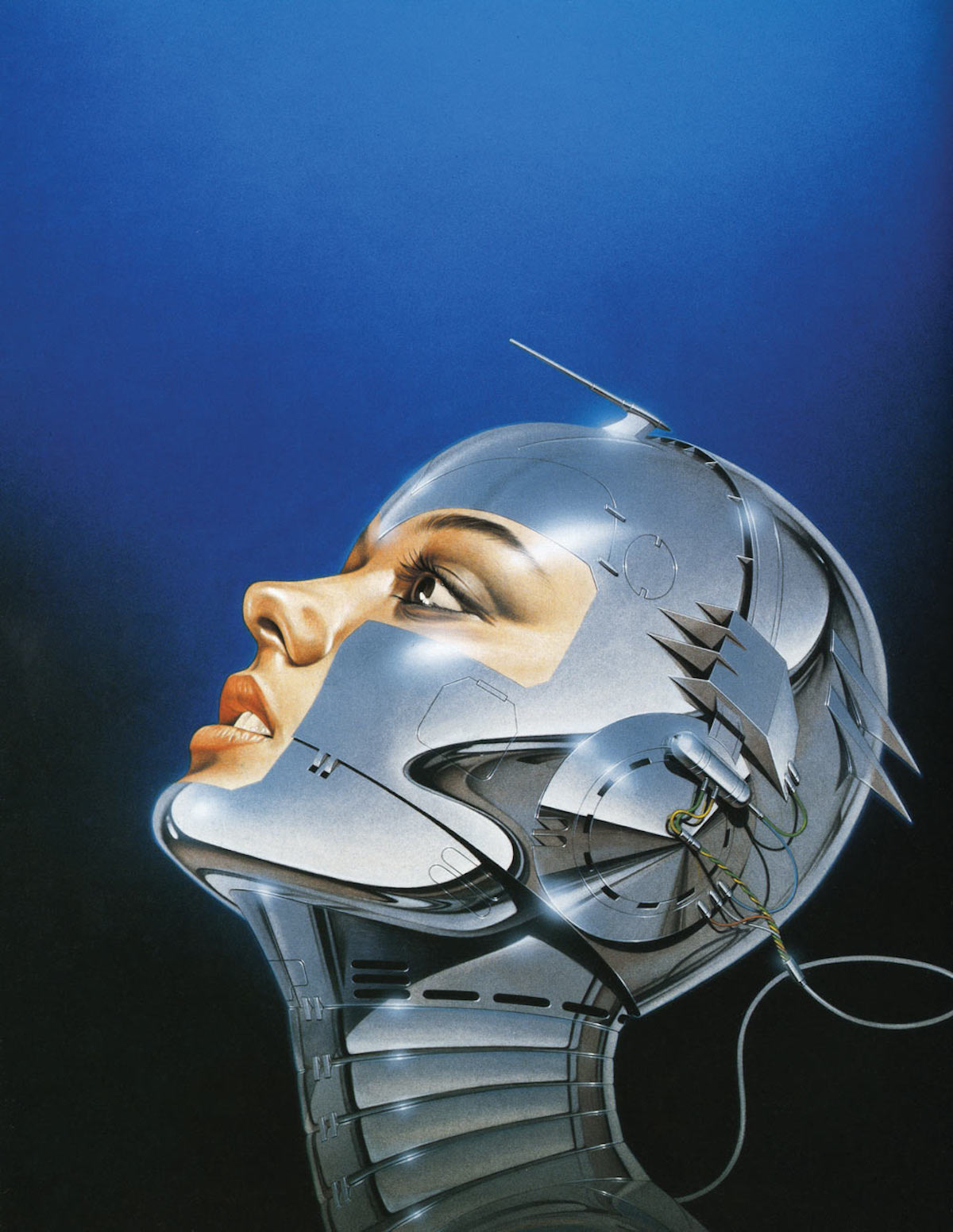 Su técnica, precisa hasta la obsesión, combina aerógrafo y óleo para conseguir un acabado metálico que no es frío, sino hipnóticamente cálido: cromo que transpira, acero que parece erizarse. Así nacieron sus «Sexy Robots», una serie que desde 1983 redefine lo que entendemos por mujer y máquina, adelantándose décadas a debates sobre el posthumanismo y la carne sintética.