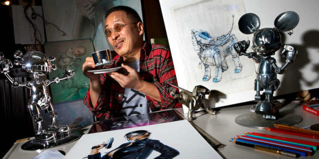 En los noventa, su imaginario saltó del lienzo a la cultura pop: colaboró con Sony en el diseño de AIBO, el perro robótico, trabajó en portadas de discos y fue absorbido por el imaginario cyberpunk. Sus robots podrían habitar tanto en una ilustración de Heavy Metal como en una pasarela de Alexander McQueen.