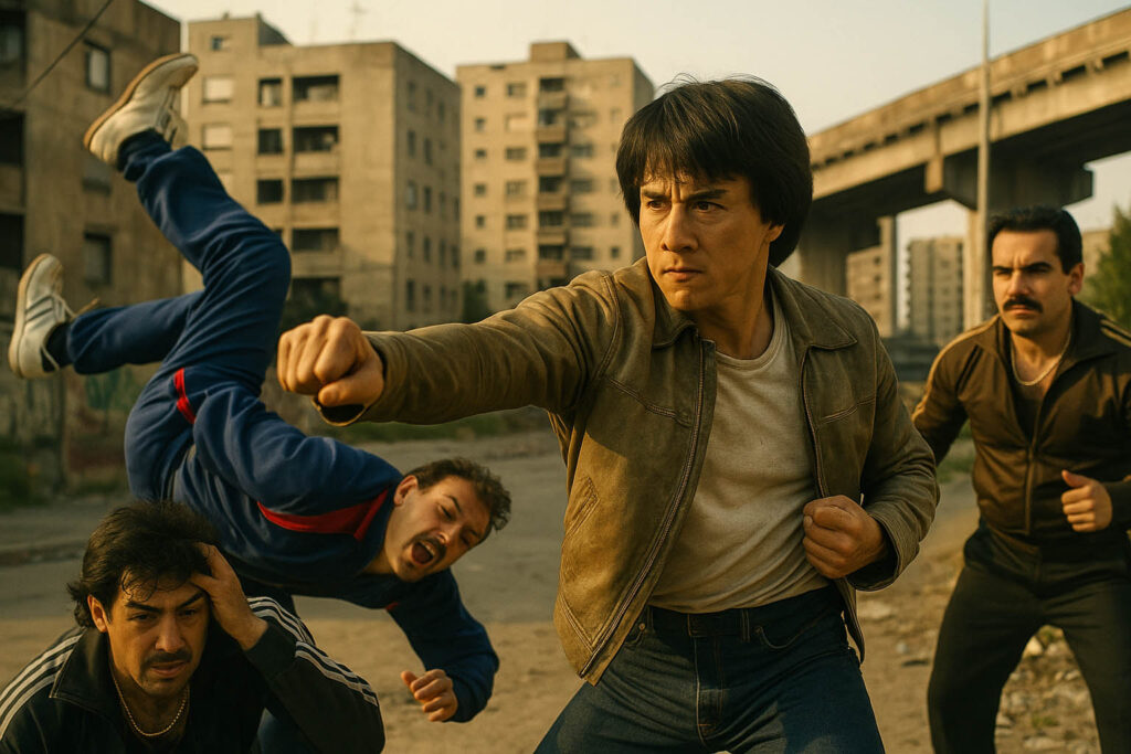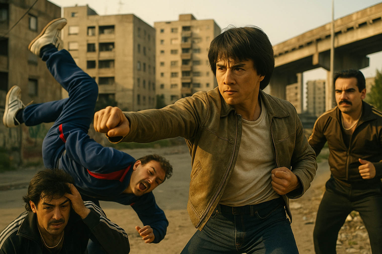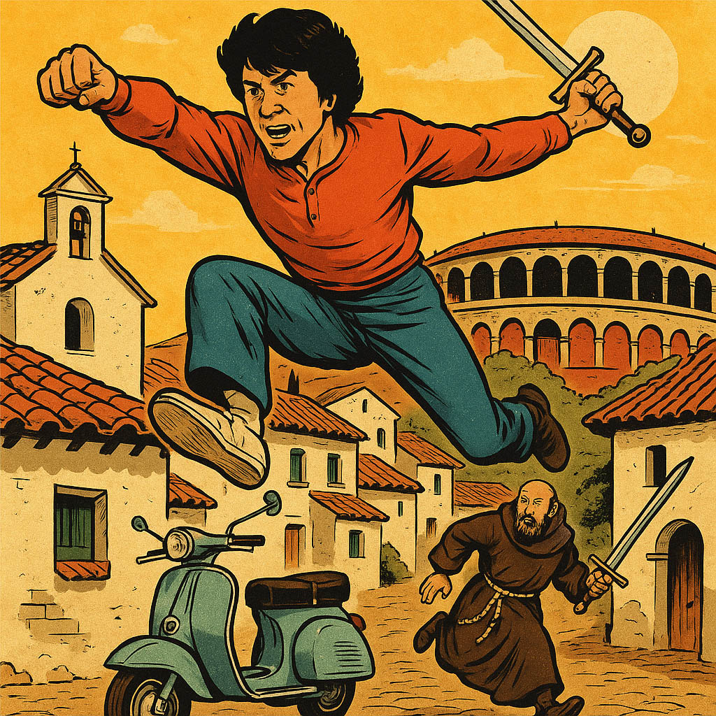 ¿Qué habría pasado si Chan hubiese rodado una película con Rafael Azcona como guionista y Luis García Berlanga como director? Quizá habríamos tenido una versión manchega de Drunken Master, con curas corruptos, funcionarios pasmados y monjas lanzando nunchakus. El cruce cultural estaba servido: la violencia lúdica del cine hongkonés y el absurdo burocrático ibérico podrían haber dado una joya subversiva.
